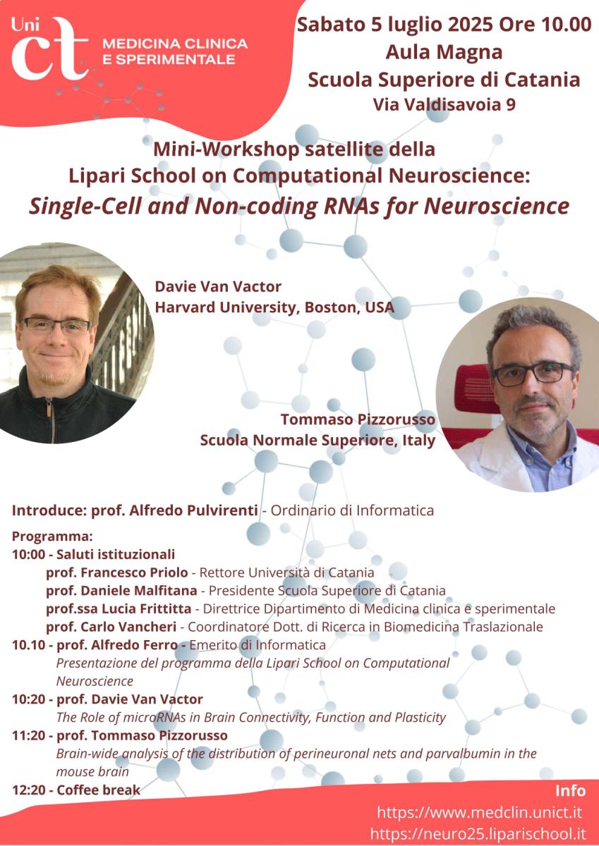 Sabato 5 luglio 2025 Ore 10:00 c/o l’Aula Magna della Scuola Superiore di Catania, Via Valdisavoia n.9 si terrà il Mini-Workshop satellite della Lipari School on Computational Neuroscience: Single-Cell and Non-coding RNAs for Neuroscience.
