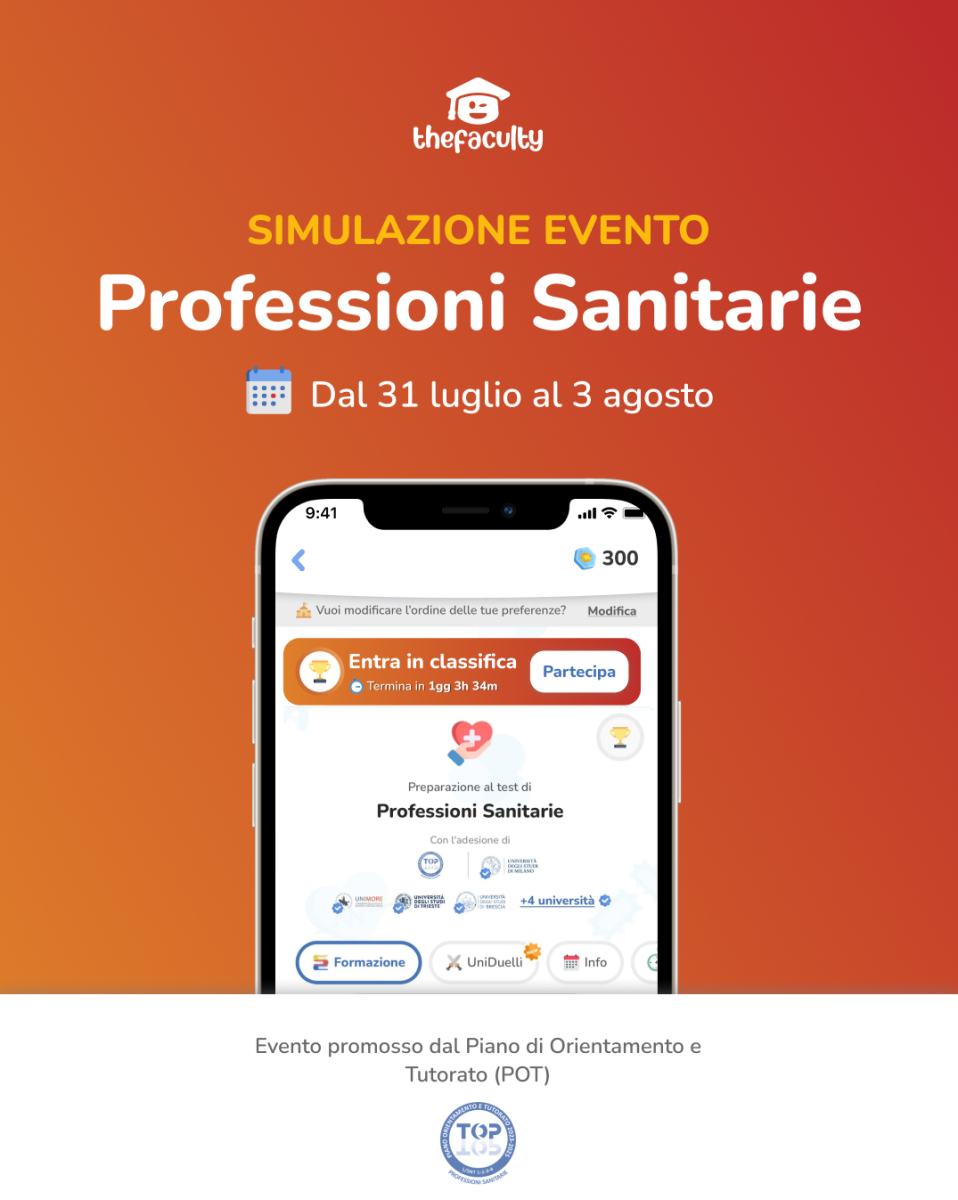 Il nostro Ateneo, in collaborazione con TheFaculty e nell’ambito del POT TOP - progetto di orientamento e tutorato delle Professioni sanitarie - ti invita a cogliere l’opportunità di partecipare a una simulazione nazionale gratuita, pensata per aiutarti a valutare la tua preparazione in vista della prova reale.