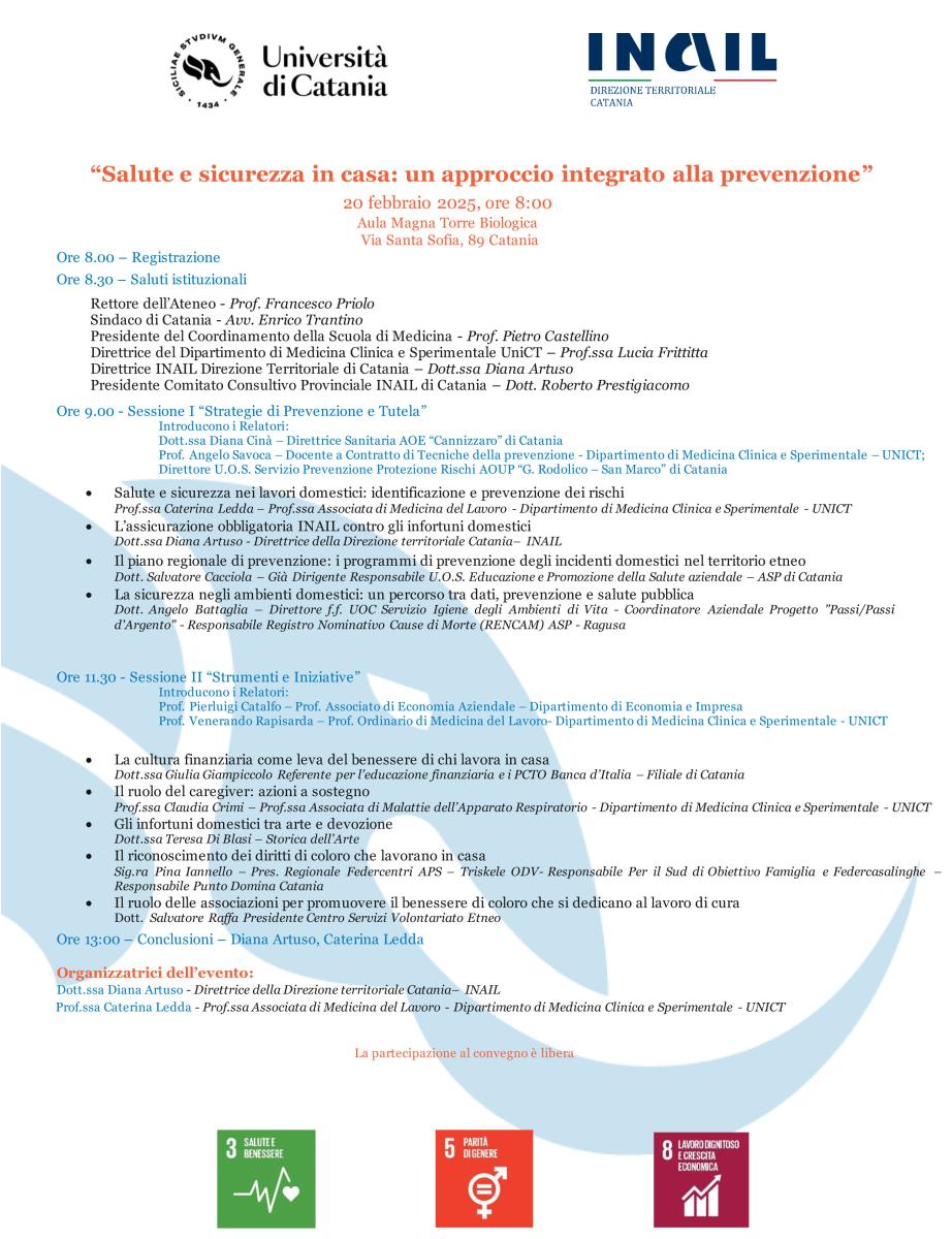 In programma per il prossimo 20 febbraio 2025, a partire dalle ore 8.00, presso l'aula Magna della Torre Biologica 'F. Latteri' - via Santa Sofia n. 89 Catania -   il Convegno sul tema "Salute e sicurezza in casa: un approccio integrato alla prevenzione". L'evento è organizzato dal dipartimento di Medicina Clinica e Sperimentale in collaborazione con la Direzione Territoriale INAIL di Catania, ed è finalizzato a sensibilizzare l’opinione pubblica e gli operatori sul tema della sicurezza domestica attraverso un approccio multidisciplinare.