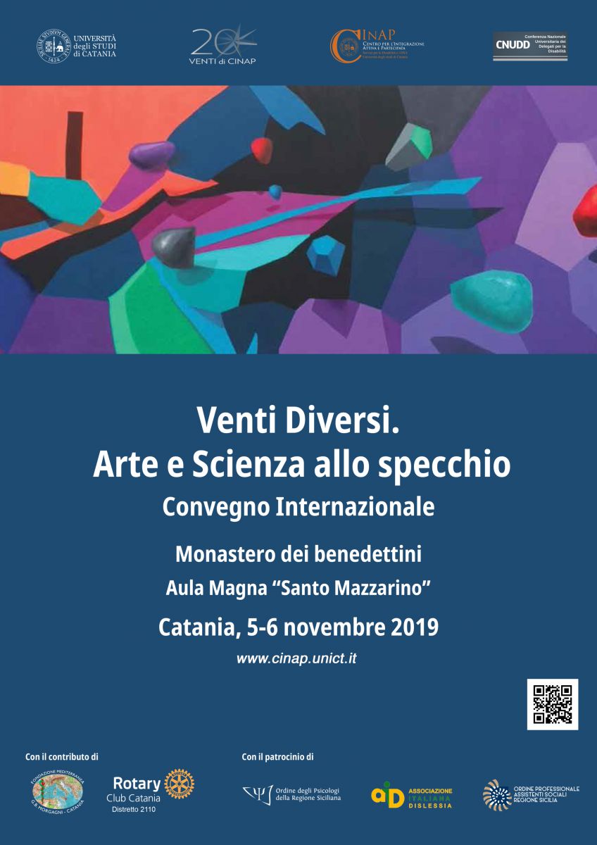 Il Centro per l'Integrazione Attiva e Partecipata (CInAP) Servizi per le Disabilità e i DSA dell'Università di Catania organizza il Convegno Internazionele "Venti Diversi. Arte e Scienza allo specchio" che si terrà a Catania il 5 e 6 novembre 2019 presso il Monastero dei Benedettini, Aula Magna "Santo Mazzarino".