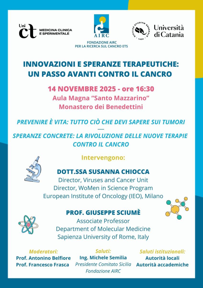 In programma venerdì 14 novembre il seminario dal titolo "Innovazioni e speranze terapeutiche: Un passo avanti contro il cancro", organizzato dal Dipartimento di Medicina clinica e sperimentale in collaborazione con la Fondazione AIRC.