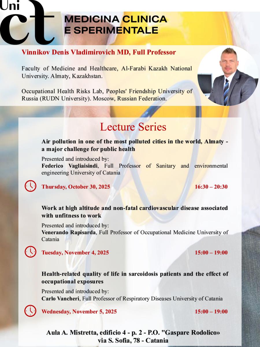 Nell'ambito del programma di Ateneo di mobilità internazionale, in programma un ciclo di seminari tenuti dal Prof. Denis Vinnikov, Professore ordinario presso la facoltà di Medicina della Al-Farabi Kazakh National