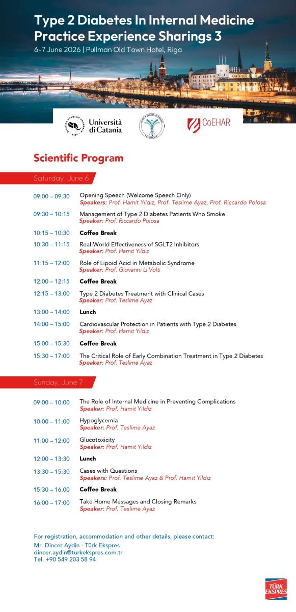 Following the first two editions held in Catania in 2025, the University of Catania, through CoEHAR – Center of Excellence for the Acceleration of Harm Reduction and the Department of Clinical and Experimental Medicine, in collaboration with the Turkish Association of Internal Medicine (DAHUDER), promotes the third edition of the international conference “Type 2 Diabetes in Internal Medicine Practice – Experience Sharings 3”, which will take place at the Pullman Old Town Hotel in Riga from June 6 to 7, 2026.