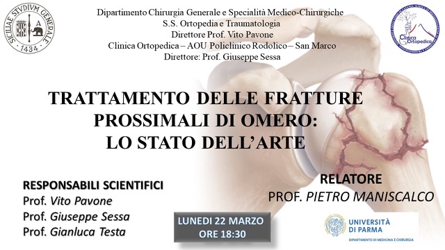 La S.S. di Ortopedia e Traumatologia ha organizzato per lunedì 22 marzo alle ore 18:30 un webinar dal titolo "Trattamento delle fratture prossimali di omero: lo stato dell'arte" rivolto agli studenti del 1°, 2° e 3° anno del CdL di TRMIR.. Relatore il Prof. Pietro Maniscalco, primario di Ortopedia e Traumatologia dell'Ospedale di Piacenza e docente dell'Università di Parma.