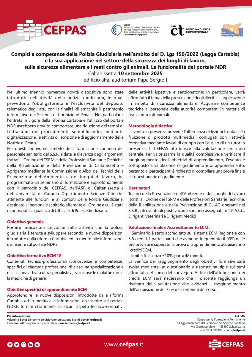 Mercoledì 10 settembre si svolgerà il seminario di formazione e approfondimento dal titolo "Compiti e competenze della Polizia Giudiziaria nell'ambito del D. Lgs 150/2022 (Legge Cartabia) e la sua applicazione nel settore della sicurezza dei luoghi di lavoro, sulla sicurezza alimentare e i reati contro gli animali. La funzionalità del portale NDR" con il patrocinio del CEFPAS, dell'ASP di Caltanissetta e dell'Università di Catania.