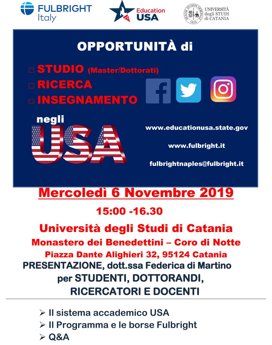 L'iniziativa, organizzata dall'Area della Ricerca in collaborazione con la Commissione Fulbright e presentata dalla Dott.ssa Federica di Martino, ha l'obiettivo di presentare le interessanti e prestigiose opportunità proposte dal programma per ricerca o studio presso istituti americani per Docenti, Ricercatori, Dottorandi e Studenti dell'Università di Catania. L'incontro sarà anche l'occasione per spiegare le modalità di partecipazione e supportare gli interessati conoscere le opportunità e l'organizzazione del sistema di formazione superiore americano.
