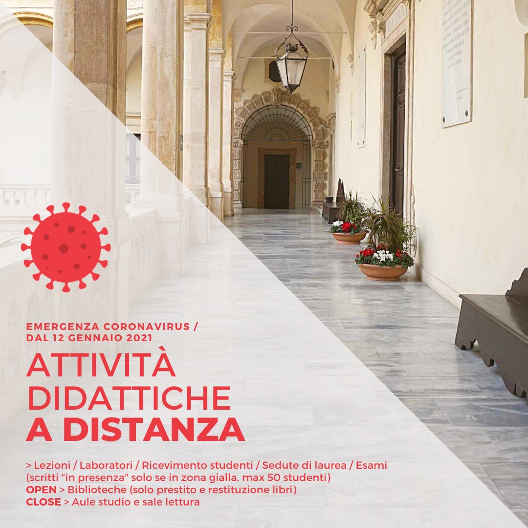 Alla luce dell’ordinanza della Presidenza della Regione Siciliana dell’8 gennaio 2021, che prevede ulteriori misure per la prevenzione e la gestione dell’emergenza epidemiologica da Covid-19, e della deliberazione del Comitato Regionale Universitario della Sicilia (Crus) dell'11 gennaio 2021, il rettore Francesco Priolo e il direttore generale Giovanni La Via hanno emanato la circolare "Misure per il contenimento e la gestione dell'emergenza epidemiologica" (prot. 1489 dell'11 gennaio 2021).