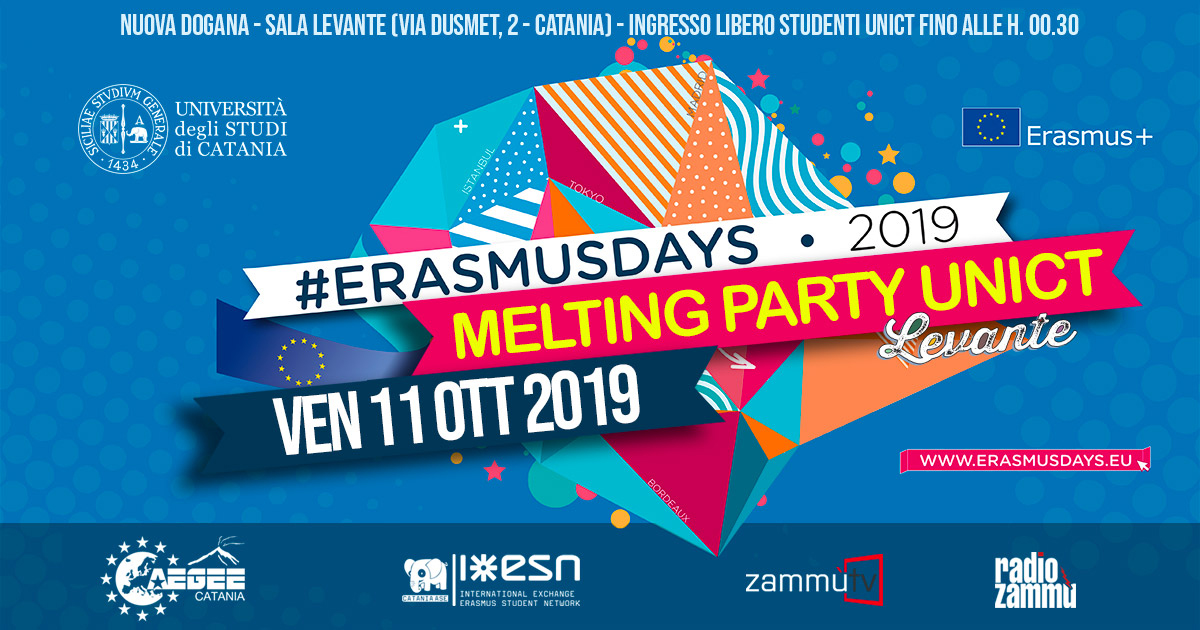 Accogliendo l'invito dell'Agenzia Nazionale "Indire" a celebrare il programma e condividere l'esperienza Erasmus+, l''Ateneo ha organizzato l' "Unict Melting Party" , una festa aperta agli studenti che che hanno già partecipato al Programma (o che intendono farlo), agli studenti stranieri in arrivo, e in generale a tutti coloro che vogliono conoscere più da vicino le potenzialità di Erasmus+. All'evento sono invitati anche i docenti e il personale Unict che, a vario titolo, contribuiscono al successo del più famoso programma di mobilità internazionale. Un’occasione per conosconcere e vivere l'Europa all'insegna della multiculturalità.