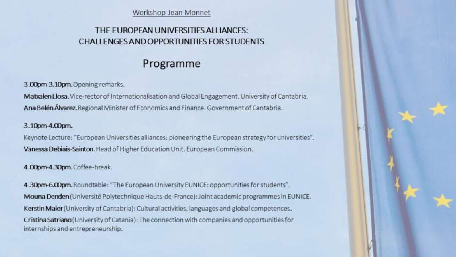 Martedì 29 novembre alle 15, nell’aula magna della Facoltà di Economia dell’Universidad de Cantabria e in streaming su Microsoft Teams, si svolgerà il workshop Jean Monnet "The European Universities alliances: challenges and opportunities for students”, organizzato dall’Universidad de Cantabria (Santander, Spagna), che insieme al nostro ateneo è uno dei partner dell’alleanza universitaria europea EUNICE European University