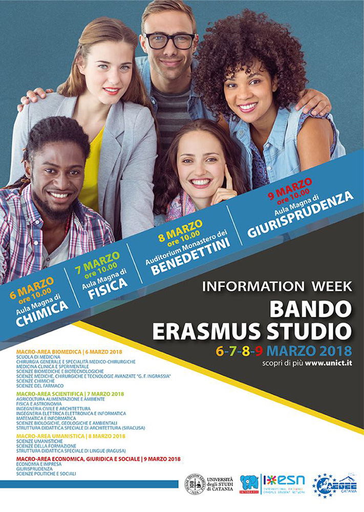 Dal 6 al 9 marzo lo staff Erasmus Unict incontrerà gli studenti nelle aule di vari dipartimenti dell'Università di Catania per presentare i contenuti e le novità previste dal bando 2018/19