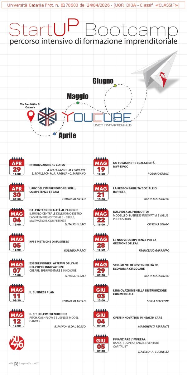 La durata complessiva è di 45 ore, che si svolgeranno presso la sala conferenze dell’incubatore d’Ateneo YOUcube –